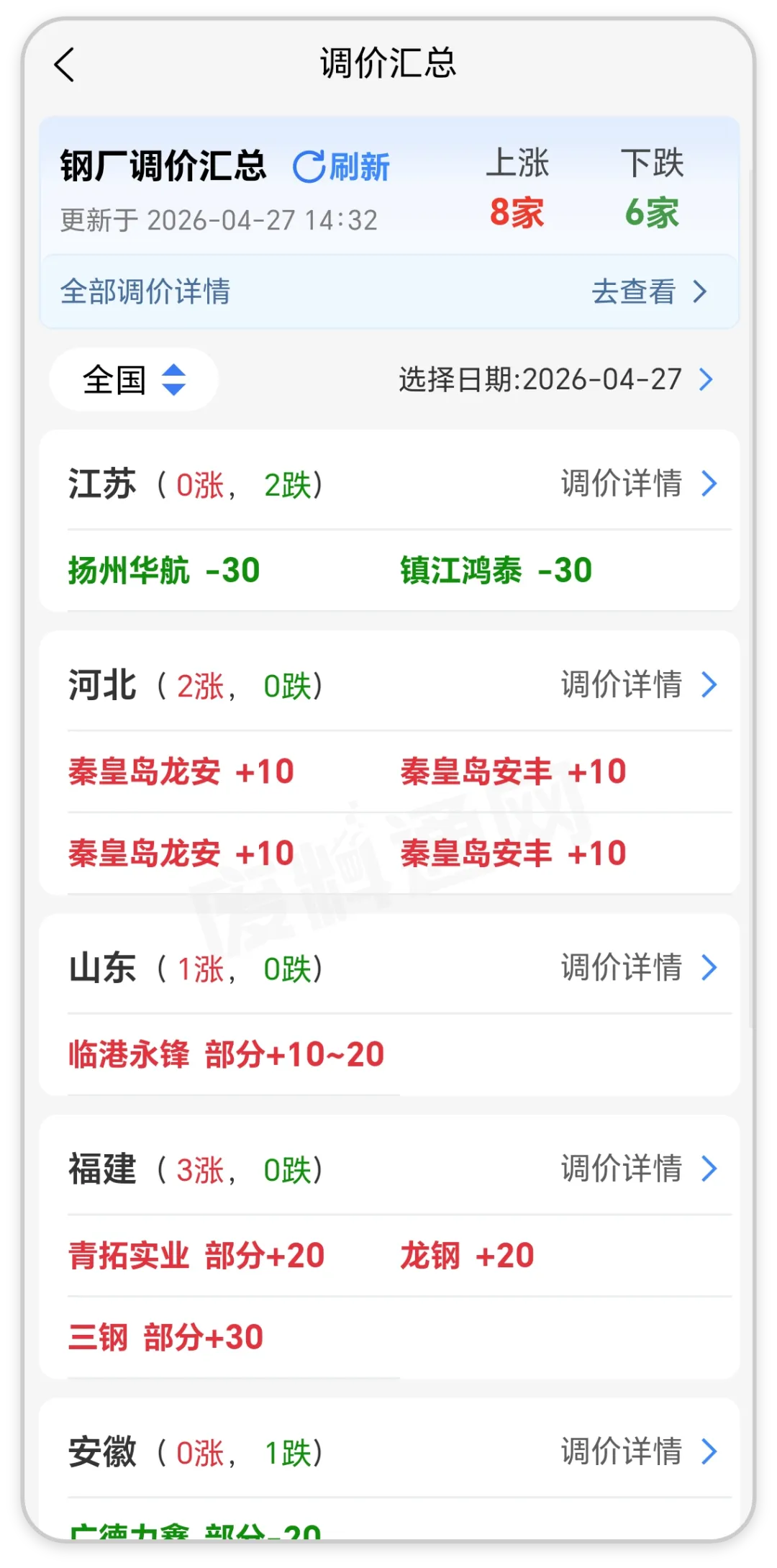 4月27日江苏【镇江鸿泰】跌30,最新价:新钢筋头:2260,新钢板料:2290,重废1:2260,重废2:2220,中废:2160,剪料1:2090,剪料2:1890,冷热轧冲子:2190,镀锌冲子:2160,冷热轧冲皮:2120,镀锌冲皮:2090,冲皮统料:1990,矽钢片:2150,一级破碎料:2200,二级破碎料:2100,钢刨花:2000,数控刨花:1950,普通刨花:1900,轻钢龙骨/钢丝绳:1850,废钢统料:1680,不含税4月27日即刻起河北【秦皇岛龙安】所有料型上调10元,满价2440元最新价:道轨2440元,20mm以上重废2420元,冷板小料(一水4mm)2410元,手撕钢筋头2410元,575模板2320元。不含税