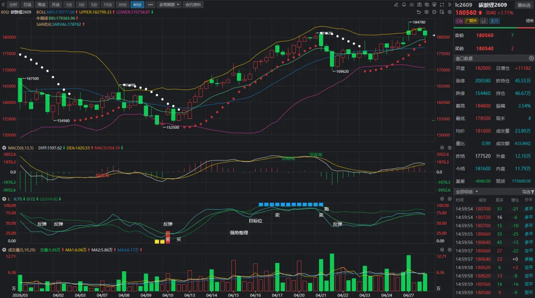 前期一路逼空的碳酸锂,今天在高位出现了明显的 “强弩之末” 信号: 价格最高冲到 184780,随后震荡回落,日增仓 + 11182 手,资金追高意愿明显下降。 MACD 指标已经出现顶背离,K 线在布林带上轨下方收出了一根上影线,这是典型的高位滞涨信号。虽然趋势还没完全反转,但继续往上冲的动能已经严重不足了。