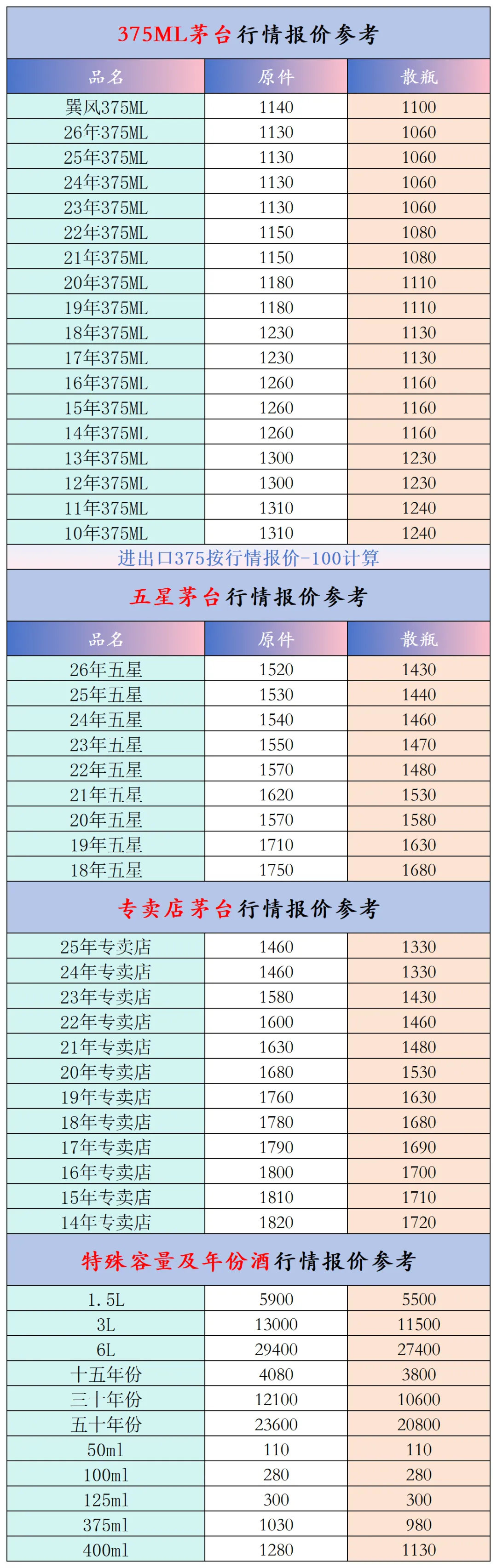 本公众号提供各种名酒回收行情报价,常规茅台、五粮液、洋河、剑南春、国缘等。所有报价根据市场买卖行情总结而来,每天更新最新报价!部分酒水每天涨跌幅较大,无法及时更新请谅解。本报价仅供参考,并非实际成交价格。感谢您的关注!我们会竭尽所能,提供更多更好的服务。