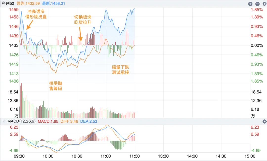 技术特征:指数白线持续运行于黄线上方,显示权重股相对抗跌