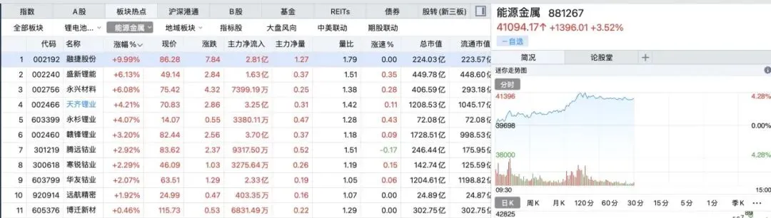 板块整体涨幅约4%,呈现强势上涨态势,日内持续上行,成交量明显放大,资金活跃度高,锂电池成为推动板块上涨的核心力量,钴金属亦有贡献。