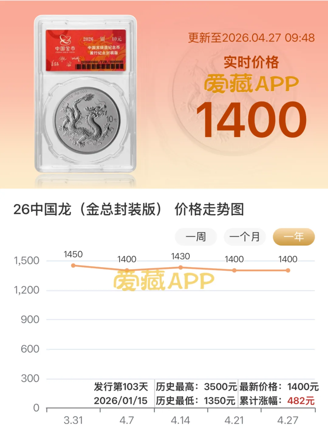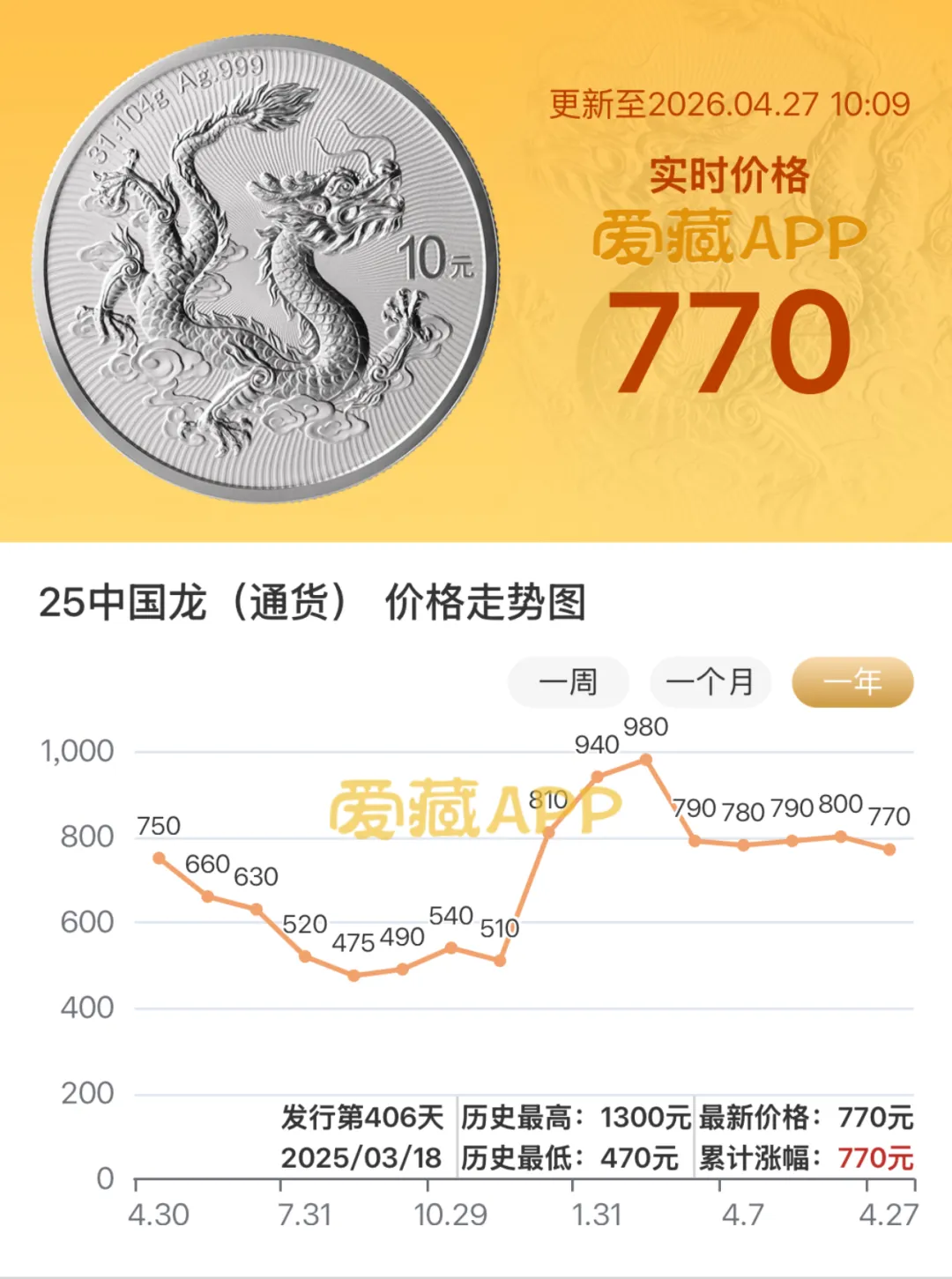 作为国民度极高的生肖藏品,龙银币自发行起就自带流量,行情走出了标准的“过山车”走势:首发阶段溢价暴涨、一夜出圈,后续持续阴跌回调,多个银行渠道版本直接跌破发行价,大量高位接盘的藏友深度被套。