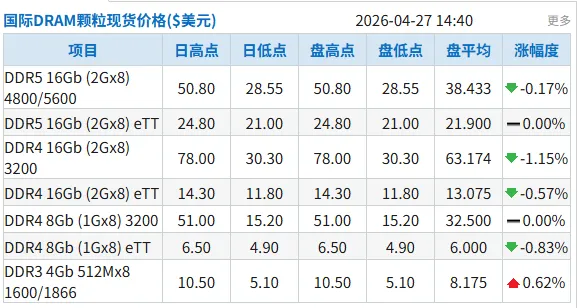 今日DRAM现货市场涨幅主要聚焦DDR3,其中DDR3 4Gb 256Mx16 1600/1866上涨1.58%,均价6.933美元,DDR3 2Gb 128Mx16 1600/1866上涨1.24%,均价5.05美元。