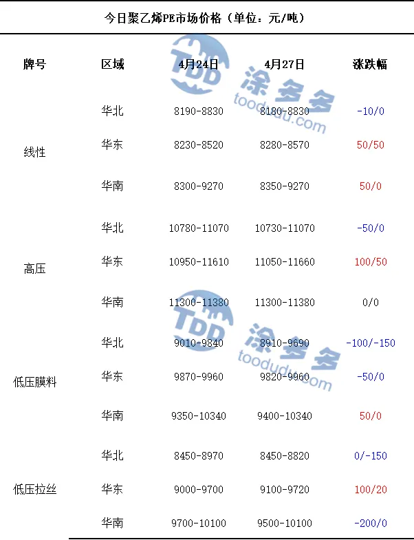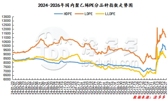 今日国内PE市场价格整体呈现涨跌共存的走势。华北地区线性、高压、低压膜料、低压拉丝牌号的市场价格均有不同程度的下跌,价格下调区间在10-150元/吨,华东地区仅低压膜料牌号的市场价格下跌,线性、高压、低压拉丝牌号的市场价格均较上周五上涨,整体价格调整区间在20-100元/吨,华南地区仅高压牌号的市场价格维持稳定,低压拉丝牌号的市场价格下跌,线性、低压膜料牌号的市场价格上涨,整体价格波动区间在50-200元/吨。现阶段聚乙烯主流生产企业出厂报价整体以平稳运行为主,市场调价表现分化明显。场内调价跨度偏大,部分货源上调幅度维持在30-400元/吨,同时另有部分货源下调幅度达到50-800元/吨。受整体行情影响,贸易商出货心态偏向主动,普遍采取让利走货的操作来加快流转速度。下游工厂采购节奏始终保持理性,仅依据日常生产刚需进行拿货,并不会盲目大批量备货。整体市场交投大多依托实时报价灵活调整,成交均以实际商议价格为准。叠加市场多空心态相互博弈,再加上五一假期临近,市场低位货源的补库需求有所提升,业内节前补货意愿有所增加,也进一步带动当下现货的整体交易氛围。