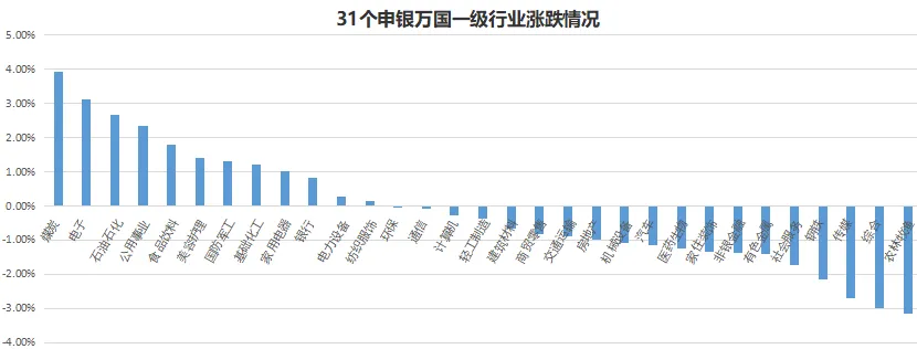 近五个交易日31个申万一级行业板块多数下跌。其中煤炭、电子、石油石化涨幅居前,农林牧渔、综合、传媒跌幅居前。