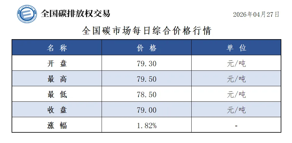 今日全国碳市场综合价格行情为:开盘价79.30元/吨,最高价79.50元/吨,最低价78.50元/吨,收盘价79.00元/吨,收盘价较前一日上涨1.82%。