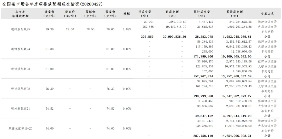 2026年1月1日至4月27日,全国碳市场碳排放配额成交量27,558,836吨,成交额2,055,896,773.41元。