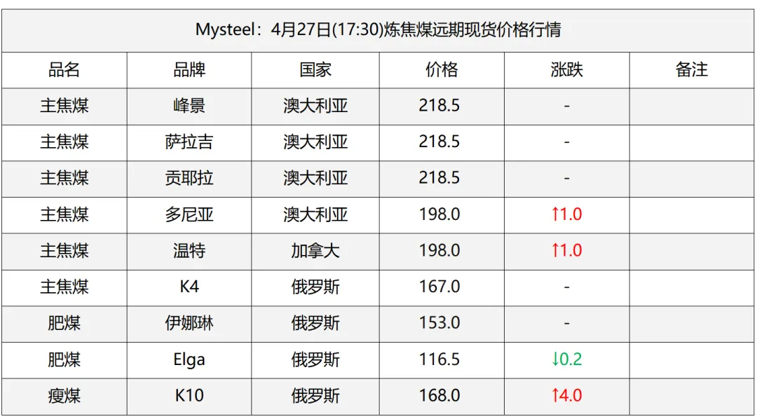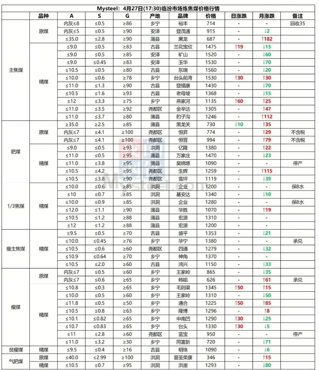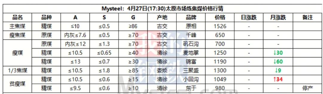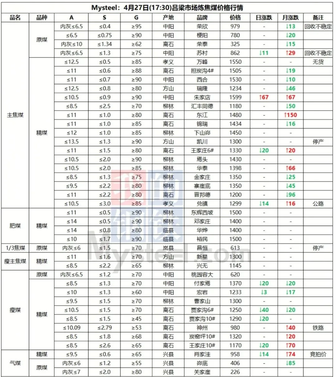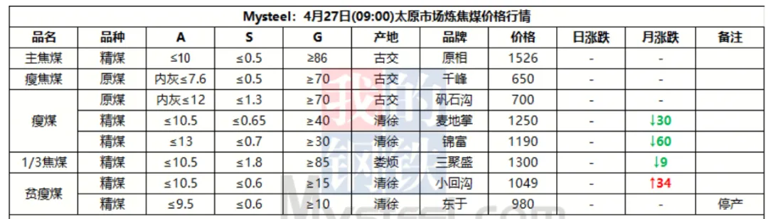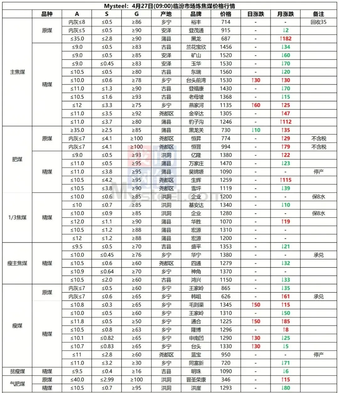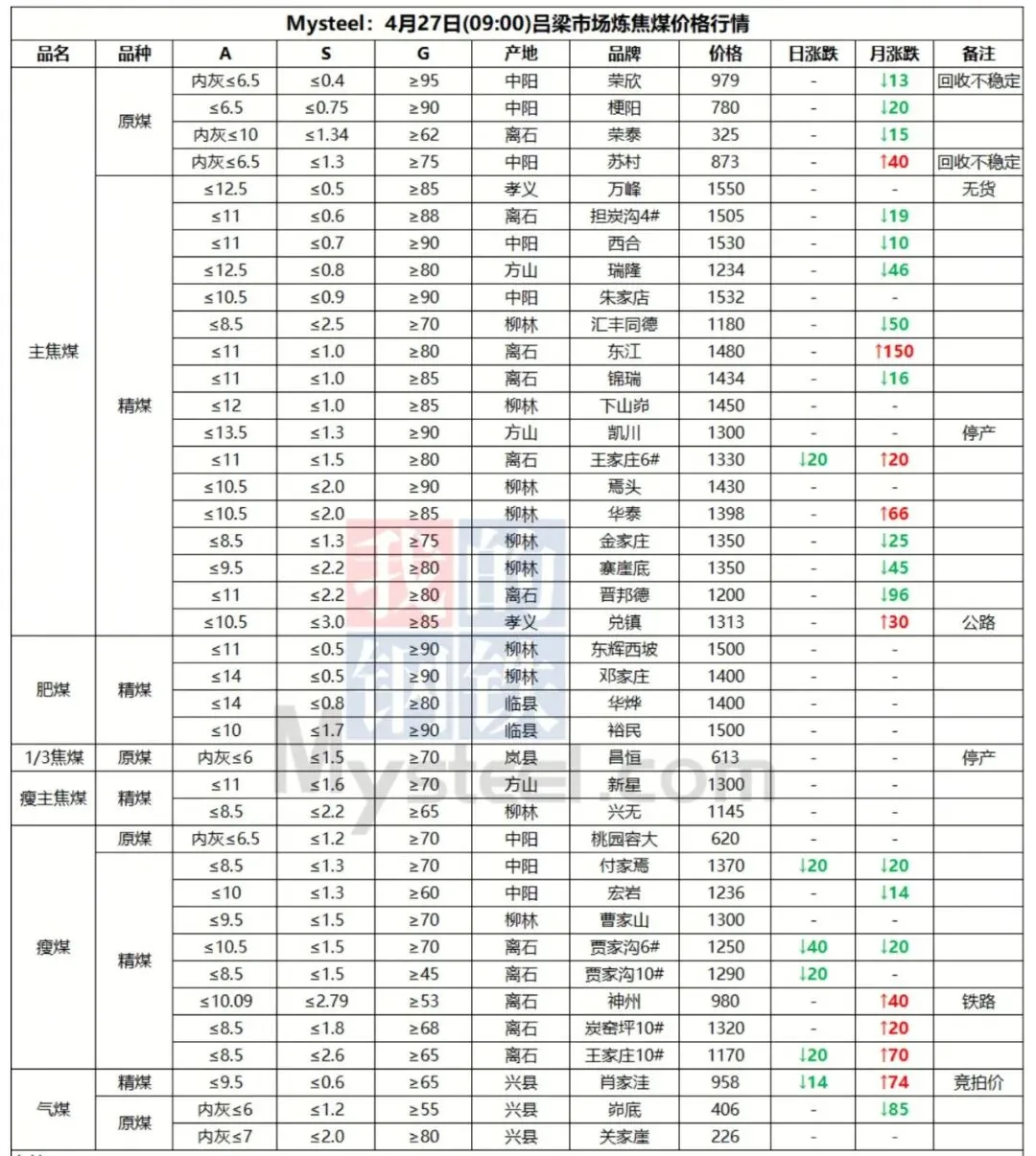 27日吕梁市场炼焦煤震荡偏强运行。供应方面,区域内产地煤矿基本保持稳定生产节奏,煤矿出货顺畅,整体库存延续去化,多数矿点厂库处于低位水平。近期线上成交活跃度增加,市场需求改善,部分煤矿报价坚挺且开始陆续小幅上调,短期价格有企稳反弹迹象。需求方面,上周主流焦企继续提涨焦炭第三轮,计划于今日落地,加之铁水产量仍处高位,焦煤刚需支撑较稳。临近五一假期,下游焦企适当补库,不过对高价煤的接受度依旧偏低,大规模囤货意向不强。综合来看,预计短期吕梁炼焦煤市场延续偏稳态势,价格短期窄幅震荡。