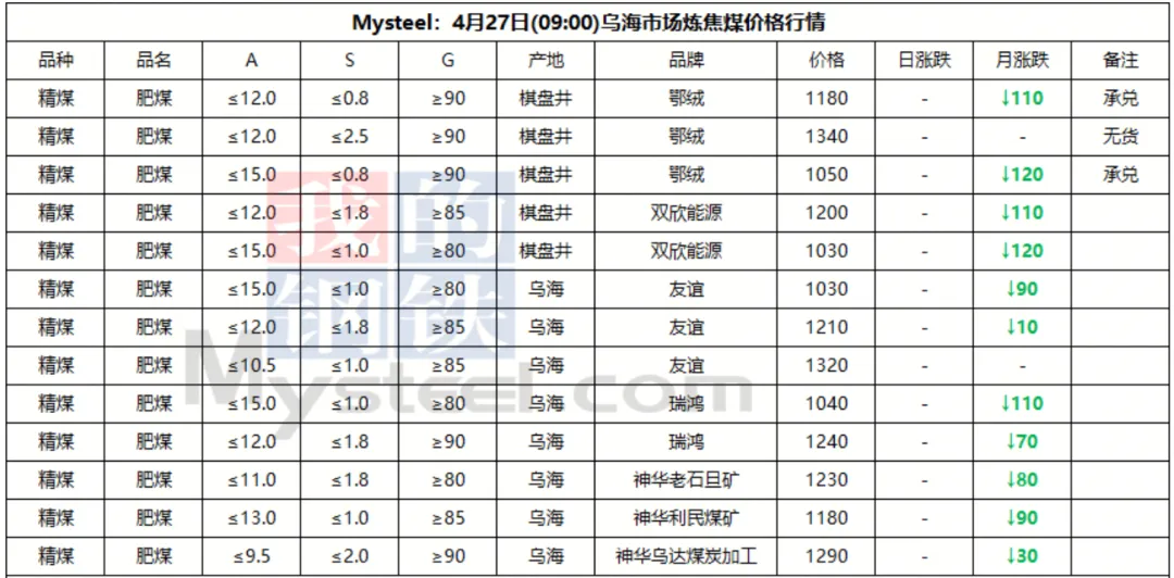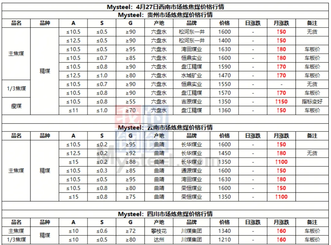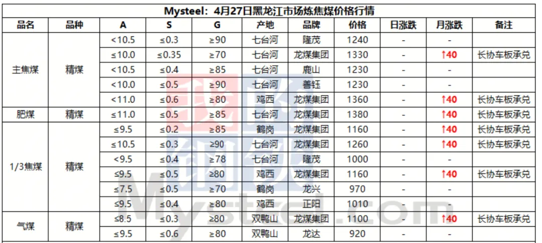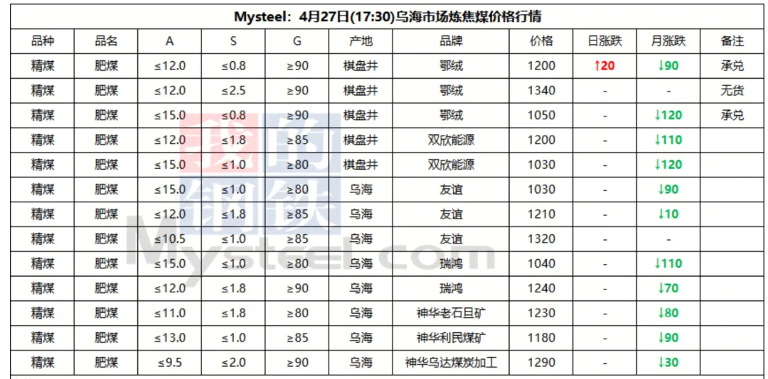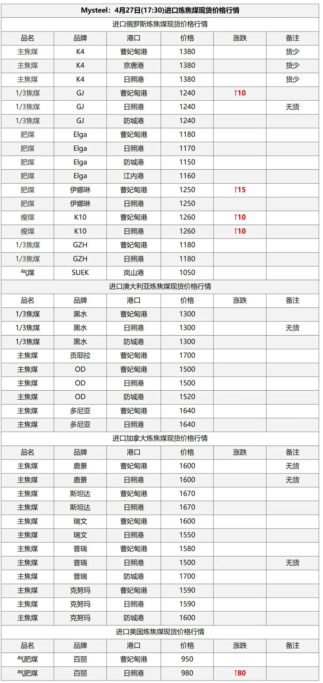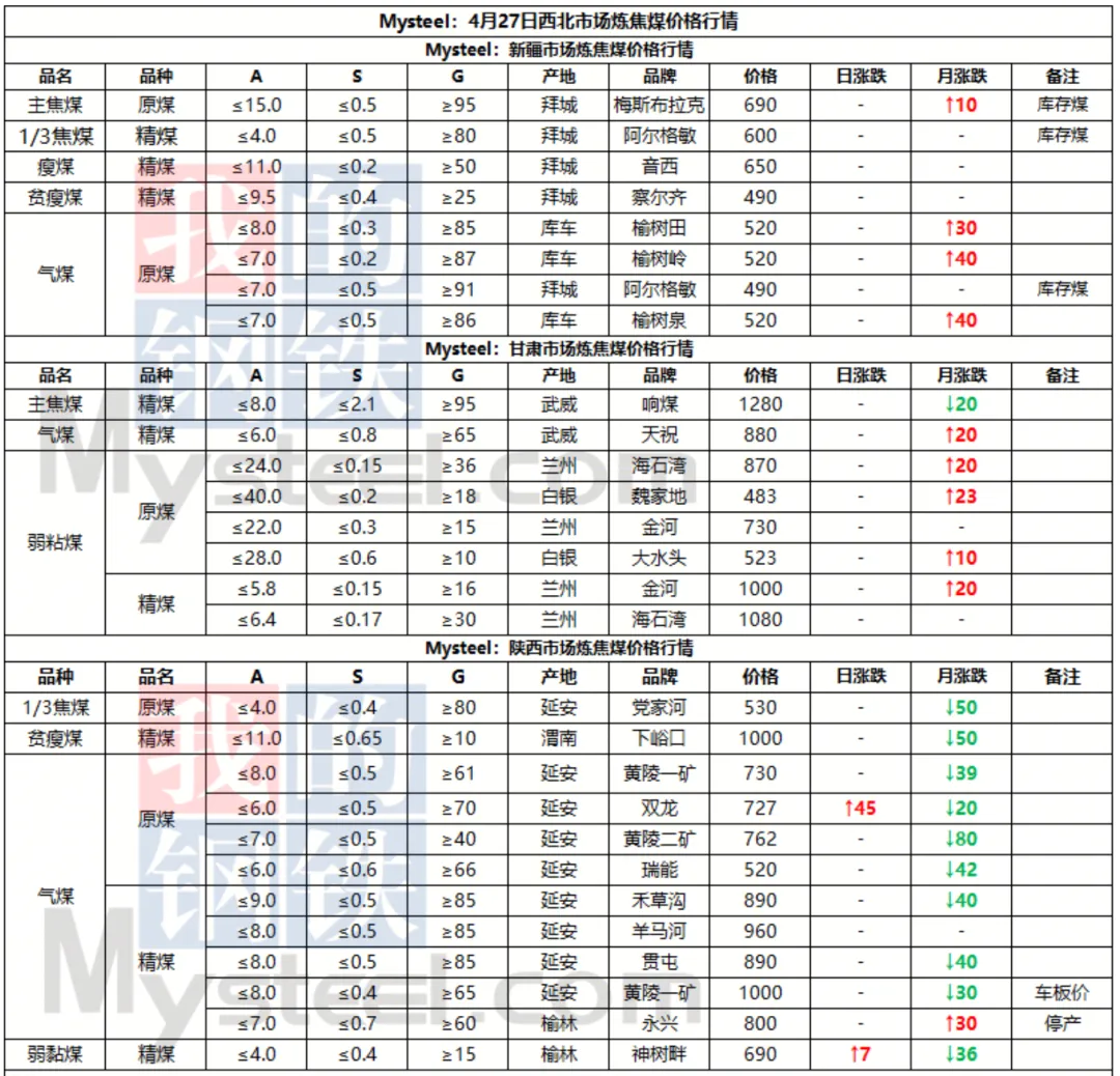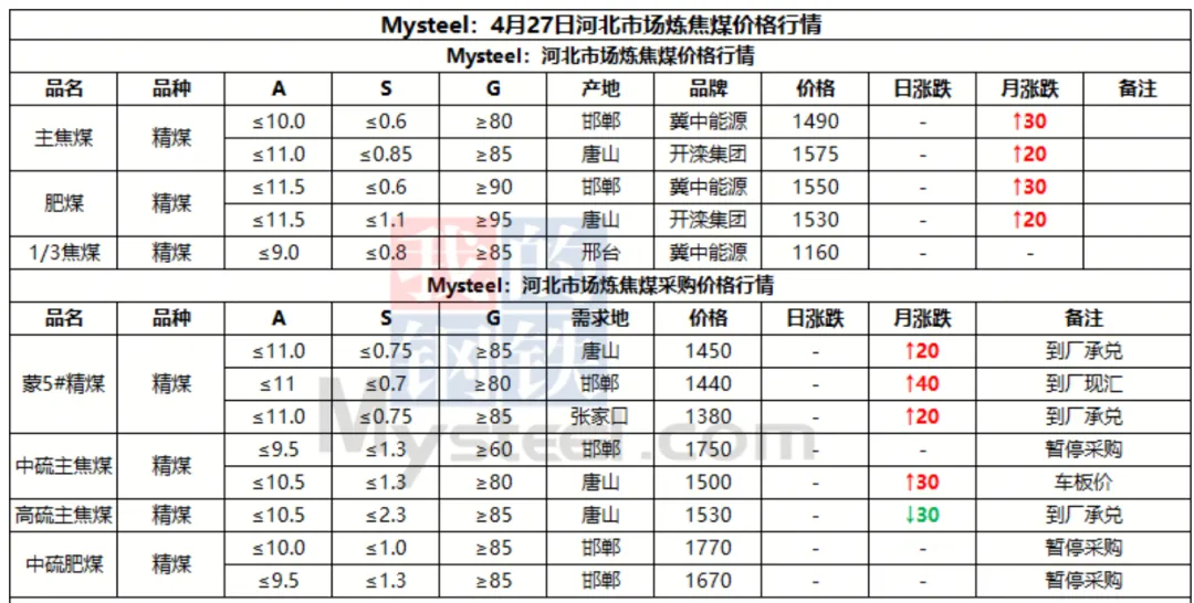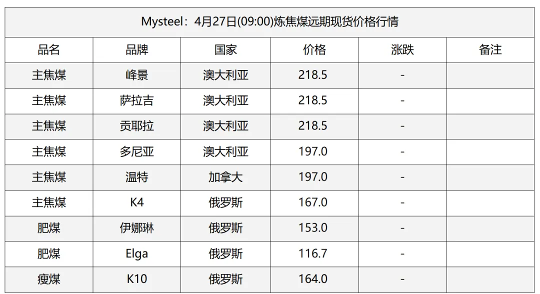 27日吕梁市场炼焦煤震荡偏强运行。供应方面,区域内产地煤矿基本保持稳定生产节奏,煤矿出货顺畅,整体库存延续去化,多数矿点厂库处于低位水平。近期线上成交活跃度增加,市场需求改善,部分煤矿报价坚挺且开始陆续小幅上调,短期价格有企稳反弹迹象。需求方面,上周主流焦企继续提涨焦炭第三轮,计划于今日落地,加之铁水产量仍处高位,焦煤刚需支撑较稳。临近五一假期,下游焦企适当补库,不过对高价煤的接受度依旧偏低,大规模囤货意向不强。综合来看,预计短期吕梁炼焦煤市场延续偏稳态势,价格短期窄幅震荡。