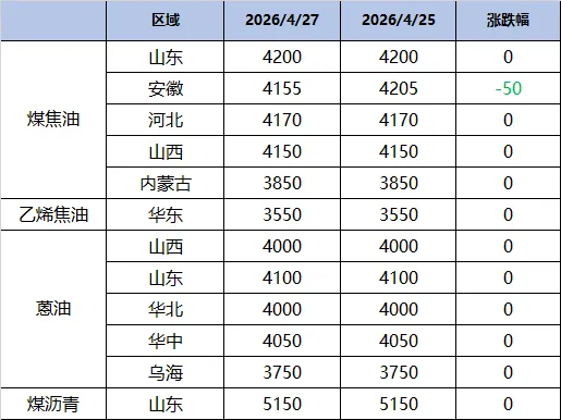 ① 4月27日,安徽临涣焦化股份有限公司高温煤焦油拍卖数量4000吨,起拍价格4150元/吨(出厂现汇、含税),最终4155元/吨,较上周下调50元/吨。