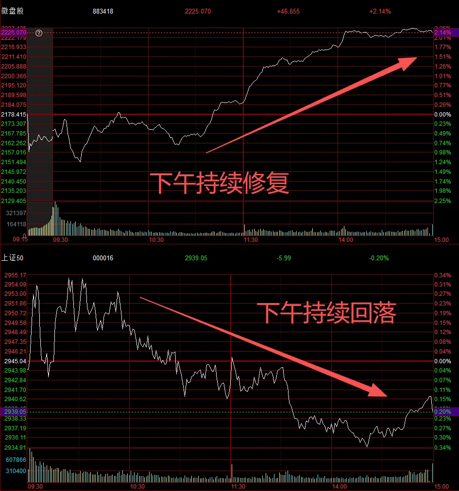 另一个角度看今天是小盘强于大盘,微盘股指数在下午修复的还比较顺畅,权重的上证50反而持续回落。