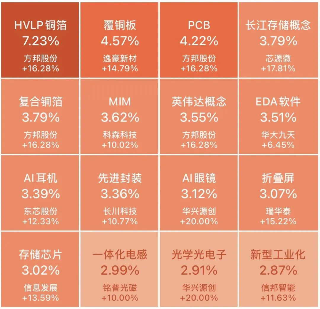 今天最强的方向给到了芯片和铜箔,英特尔美股周五晚上暴涨23%刺激了国产芯片,同时英伟达逼近前高也带给了A股做修复的预期。