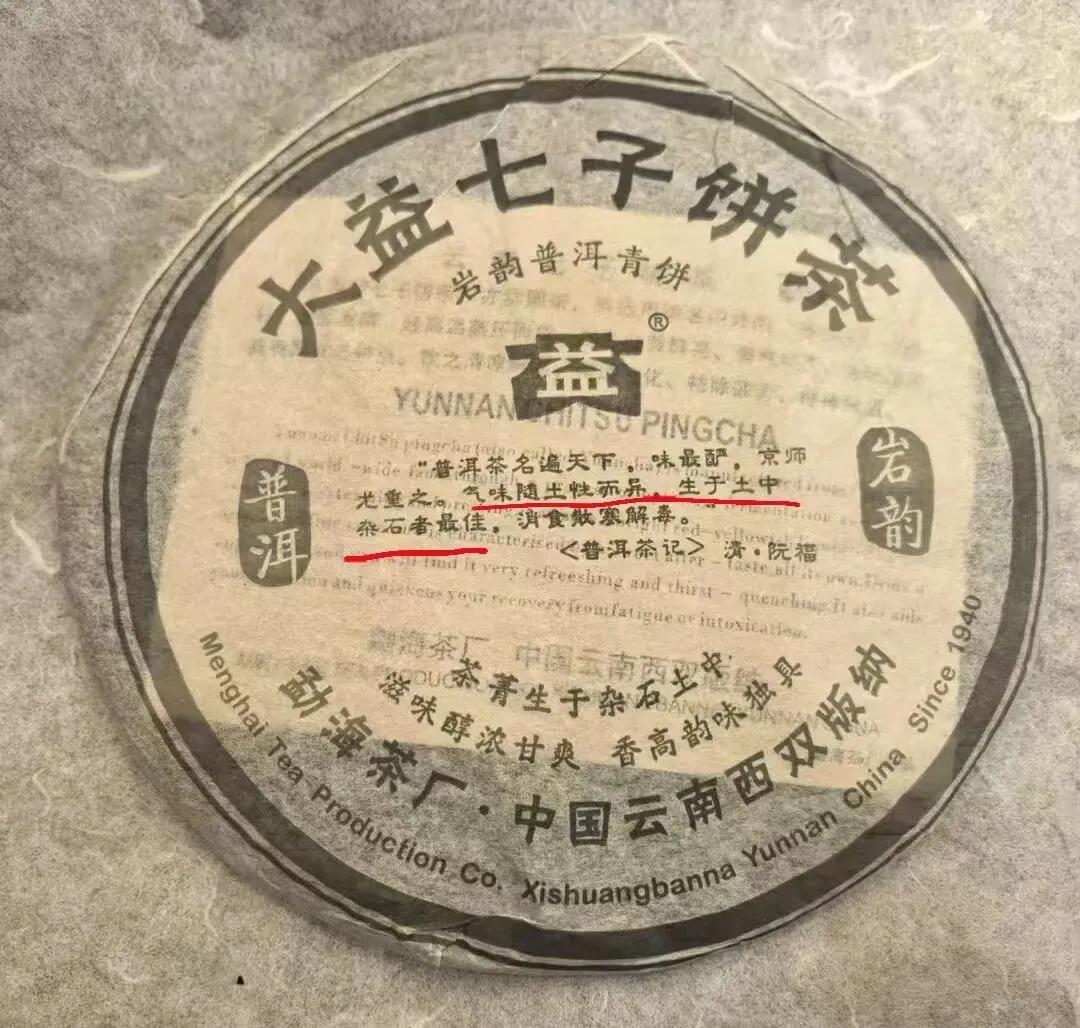 大益601岩韵,版面简约富有辨识度,棉纸上印着“岩韵普洱青饼”字样,大益商标下还节选了清朝阮福《普洱茶记》里的内容:“气味随土性而异,生于土中杂石者最佳”。
