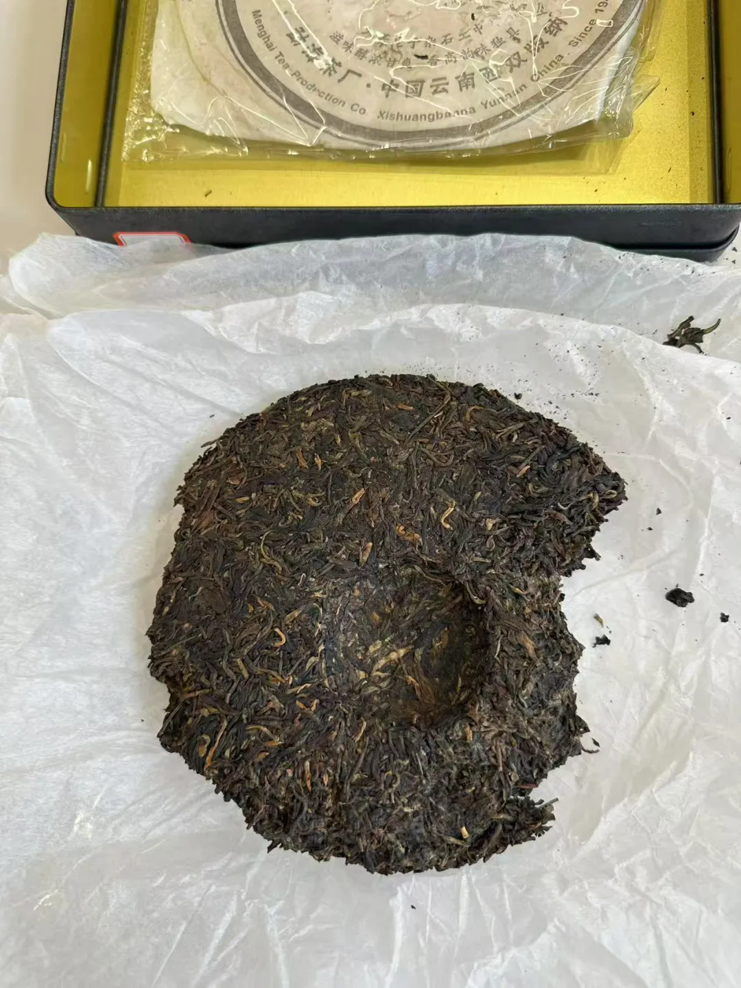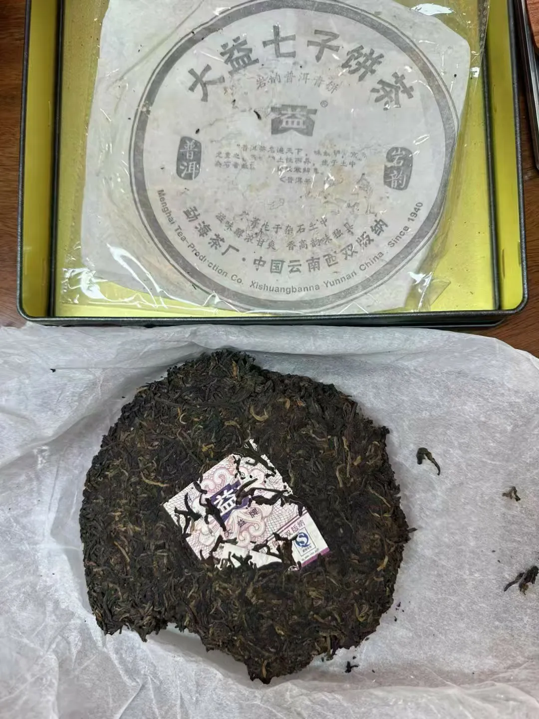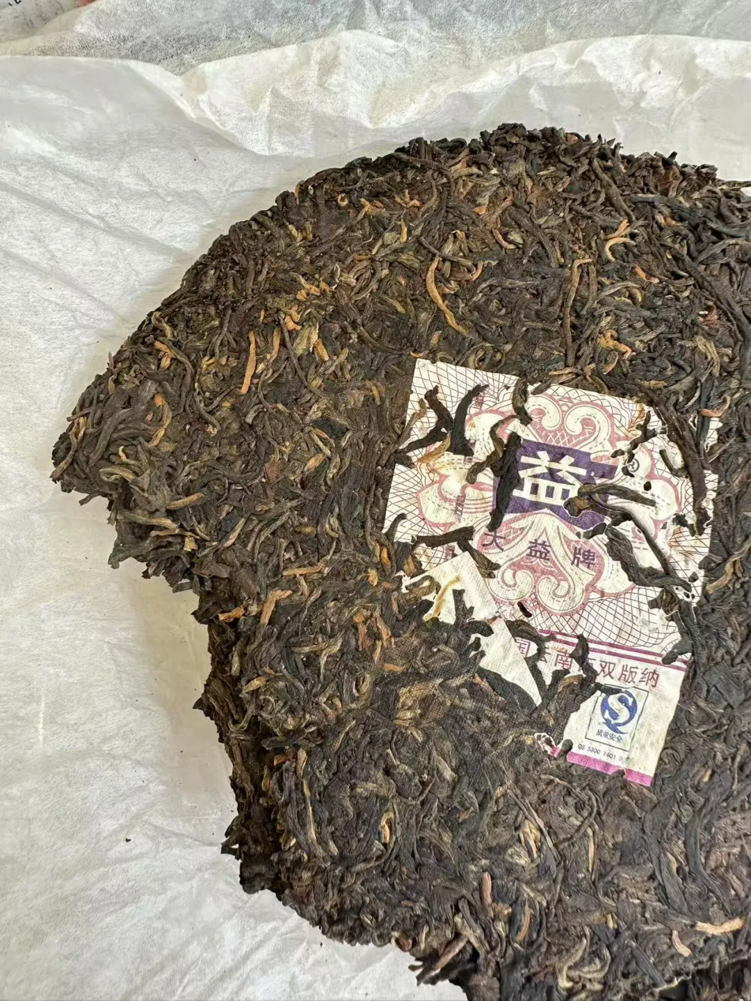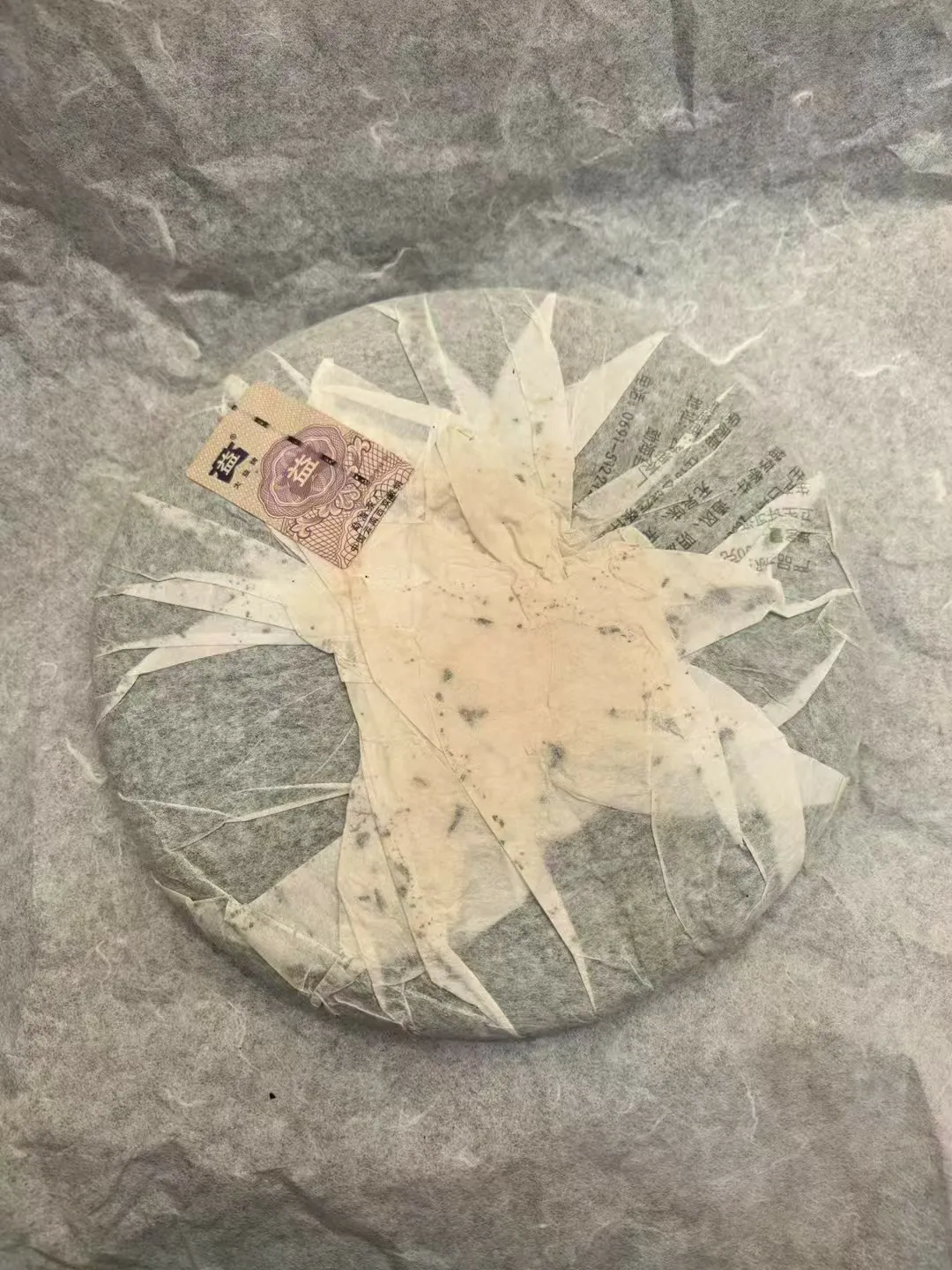 601岩韵青饼饼面乌褐油亮,条索紧实匀称,芽头秀气细嫩,历经多年陈化,芽头已经转为金黄色。