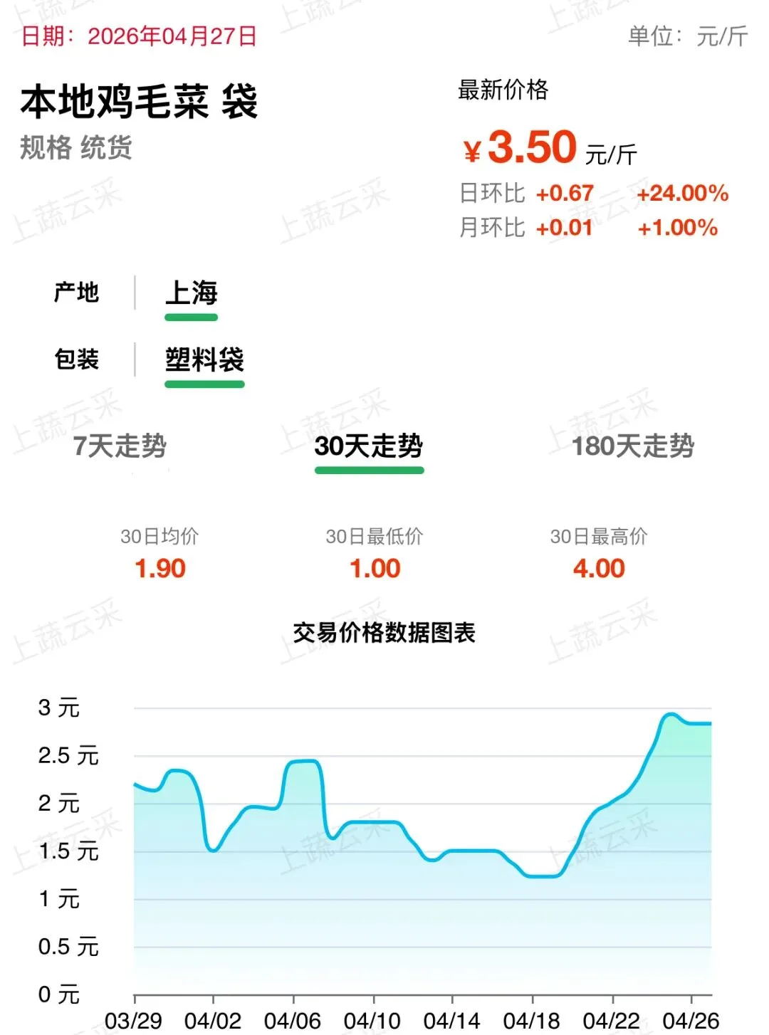 随着上海近期气温稳步回升,本地叶菜进入上市尾期。尾期货源易出现纤维老化、口感变差等情况,符合采购需求的“优品”供应量减少,继而出现了“优品优价”情况,即鸡毛菜等价格周环比增加。