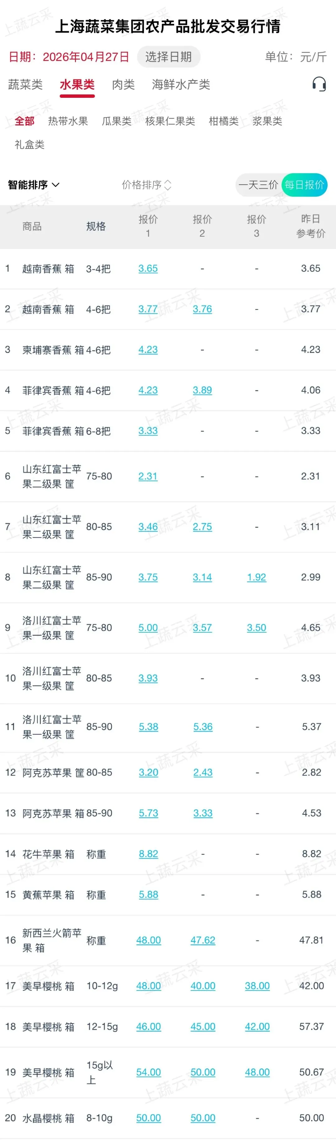 该行情每日采集发布蔬菜、水果、肉、海鲜水产等品类3000+大宗商品实时交易价格,