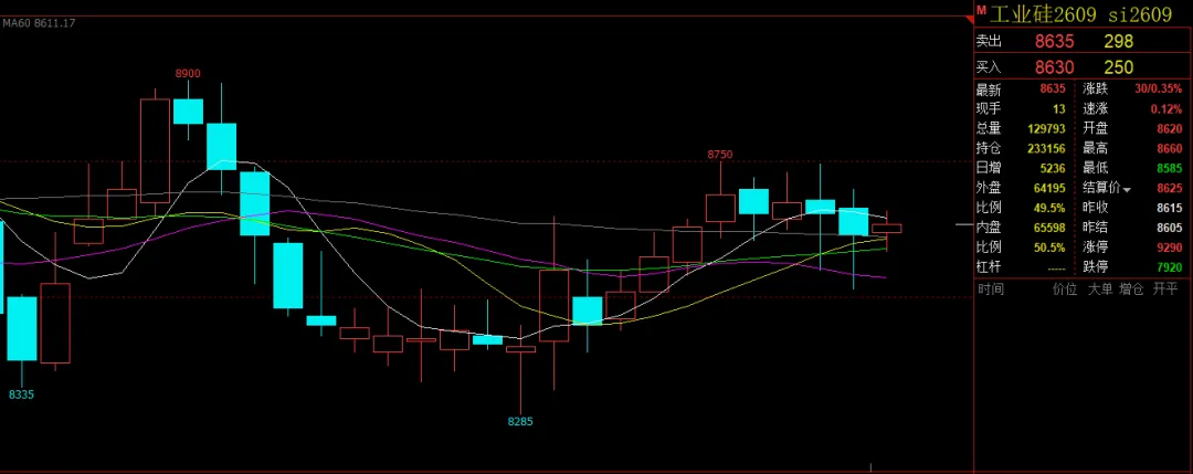 今日工业硅期货行情区间震荡运行,盘面价格相较昨日小幅调整。4月27日,截止15:00收盘,工业硅主力合约2609收盘翻红运行,开盘8620,收盘上调30至8635,涨幅0.35%,收盘价格相较上一交易日上调20。具体如下图所示: