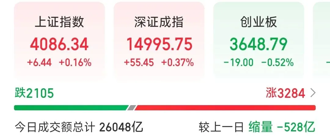 三大指数涨跌不一。截至收盘,上证微涨0.16%;深证涨0.37%;创业板指跌0.52%。结构性特征鲜明,科创50指数大涨3.76%。全市成交2.6万亿元,较前日缩量约500亿元,五一小长假期临近,量能连续萎缩,资金追涨意愿减弱。半导体、机械设备、电子行业领涨,。食品饮料、有色金属、钢铁领跌。全市共3000多家上涨,涨跌比约3:2,赚钱效应有所修复。
