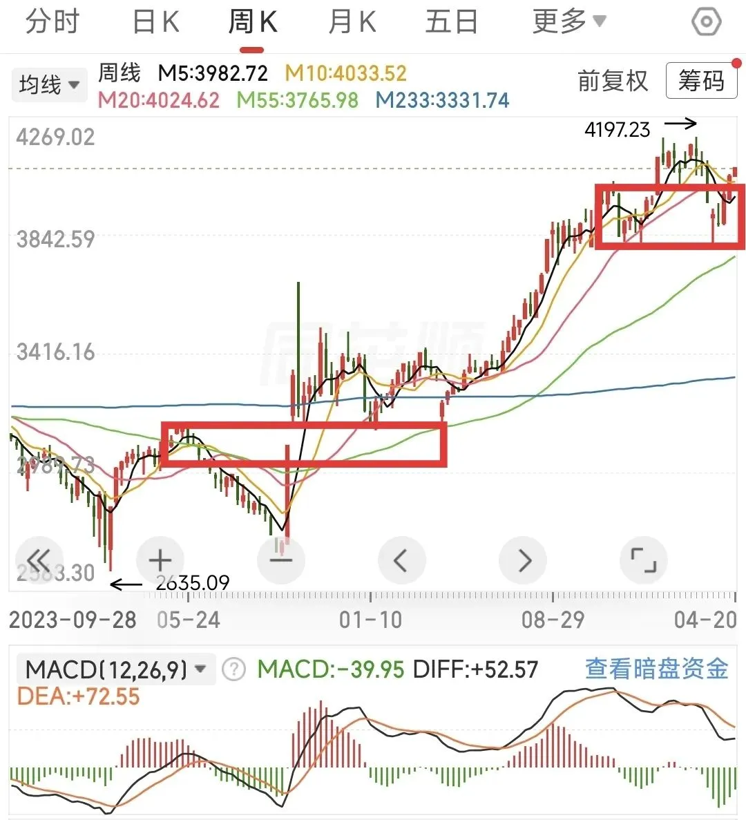 周线走势分析:2635.09点-4197.23点的这一段上涨,在周线上可以视为一个单中枢(日线级别)上涨,比较中枢的进入段和离开段,并未出现本级别的顶背离(小级别上有)。当前看,构筑第二个中枢,走双中枢上涨的概率较大,乐观估计,大概可以涨到川普串门结束,所以建议持股过节。