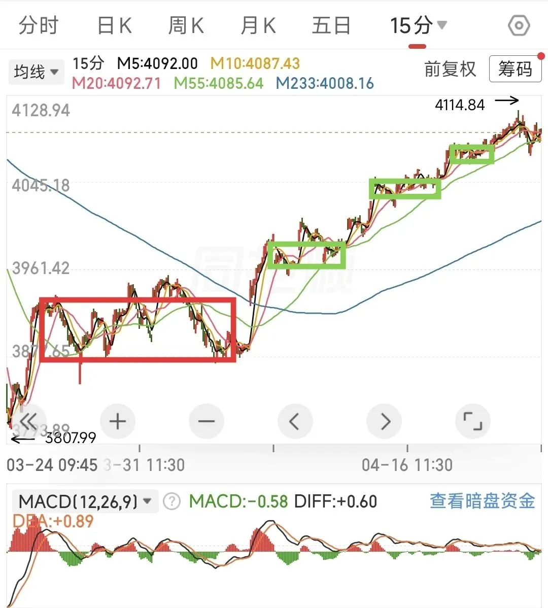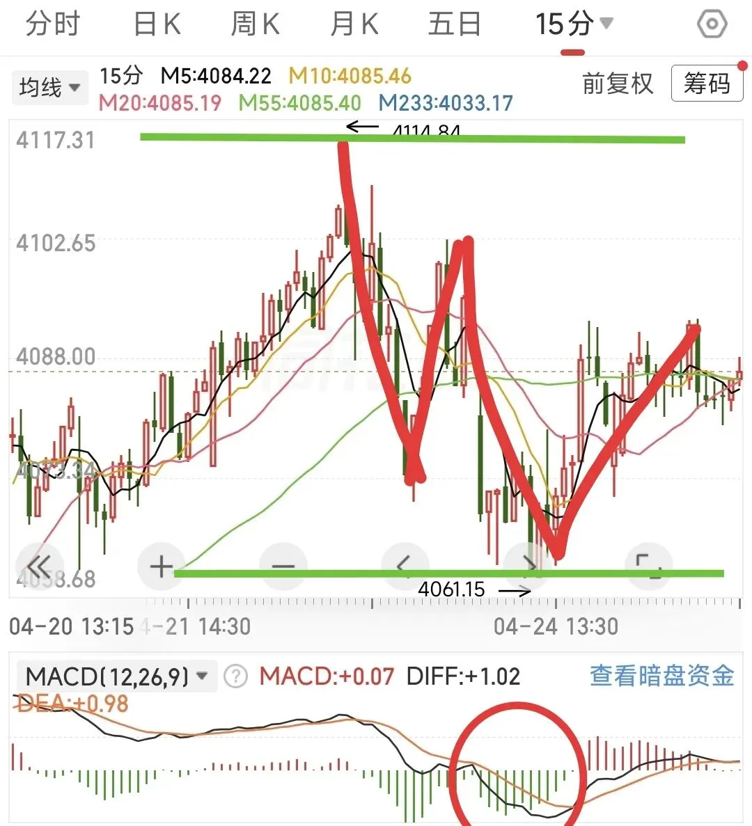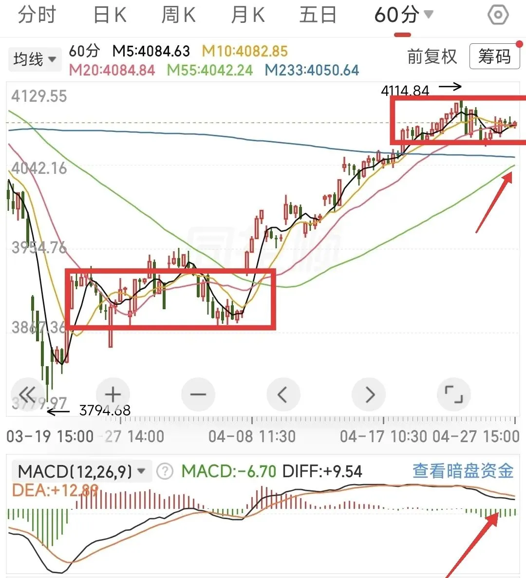 日线走势分析:纯从图形上看,4197.23点开始的下跌大概率结束,只要55线别有效跌破,后续可在60分钟级别上找底背离点或中枢下沿位置处加仓。