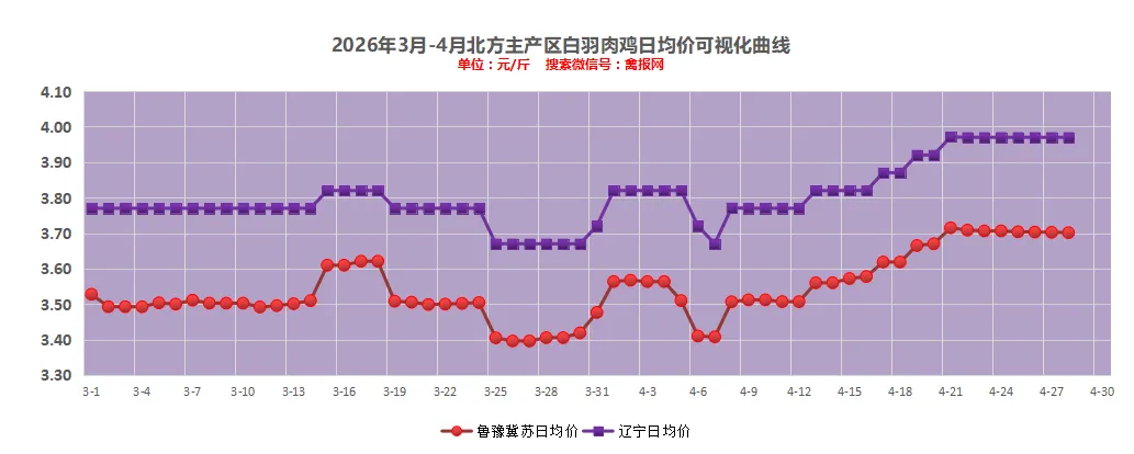(2)明天(4月28日)辽宁区域“到厂价格”较上一日统一报保持稳定,主流报价在3.95-4.00元/斤区间上下。