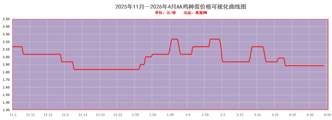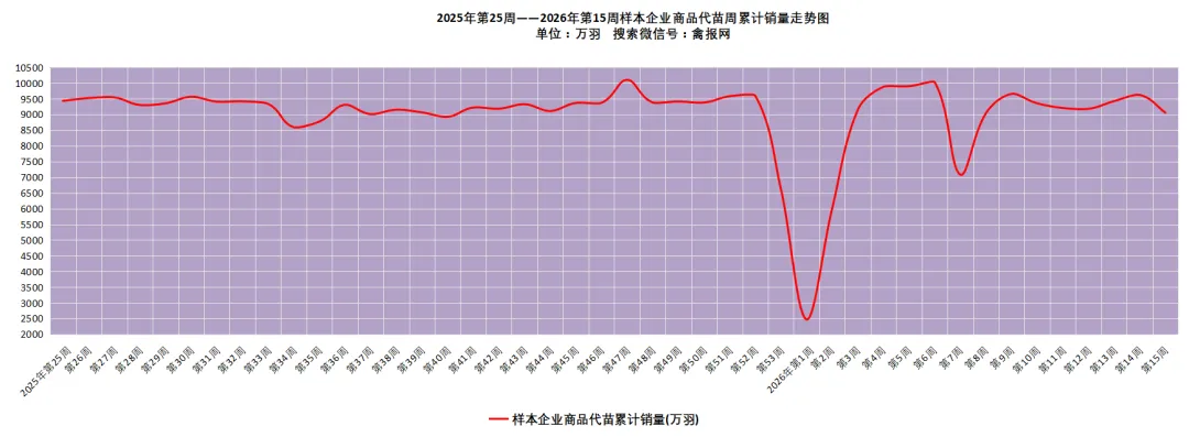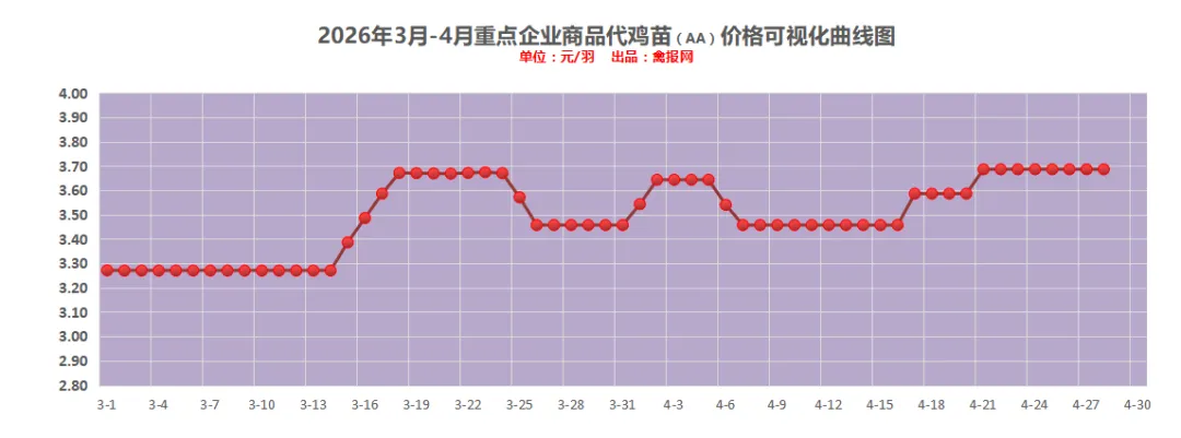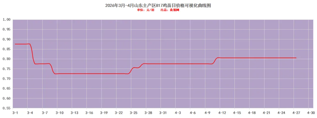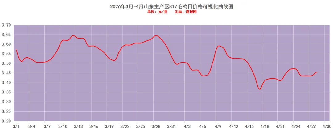 附注:2022-2023年每日毛鸡价格走势图(需求各种产业数据可后台留言)从监测样本商品苗销售数据看,2026年第15周(2026/4/13-2026/4/19)鸡苗销量数值区间在9058万羽左右(上周在9620万羽左右),较前一周环比下降了5.84%,理论上对应出栏时间在2026/5/24-2026/5/30日期间。(实际养殖过程中仍要考虑成活率等因素,以上数据只是理论销售数据)。(附注:4/27日更新)龙头孵化大场——山东报价上涨了0.00元/羽,辽宁报价上涨了0.00元/羽,具体价格为:山东报价3.90元/羽;辽宁报4.00元/羽;山东、河南、河北、江苏、安徽以及辽宁等主产区重点孵化场综合均价3.69元/羽,较上一日报价上涨了0.00。今天苗厂总体顺利,局部显慢有议价。虽然毛鸡价格处于年内最高,但是养户对后市预期仍显谨慎,控制苗价成本情绪增强。当前多点签订风险共担合同价格3.40-3.45元/斤区间上下。主产区今日综合均价1.88元/枚,较上一日报价保持稳定。具体情况:行业龙头厂家报价区间一般在1.90-2.40元/枚;分区域中小场报价:辽宁区域参考价格1.60-1.70元/枚、河南山东区域参考价格1.80-1.90元/枚。明天(4/28日)北方地区(聊城、德州、济南、新乡四个主产区)817毛鸡综合日均报价上涨了0.02,综合均值为3.46元/斤。今天(27日)主产区出箱综合均价保持稳定,主产区结算参考均价0.81元/羽左右。主流报价区间0.50-0.55元/枚,较上一日报价保持稳定。2、【今日价格行情综述】