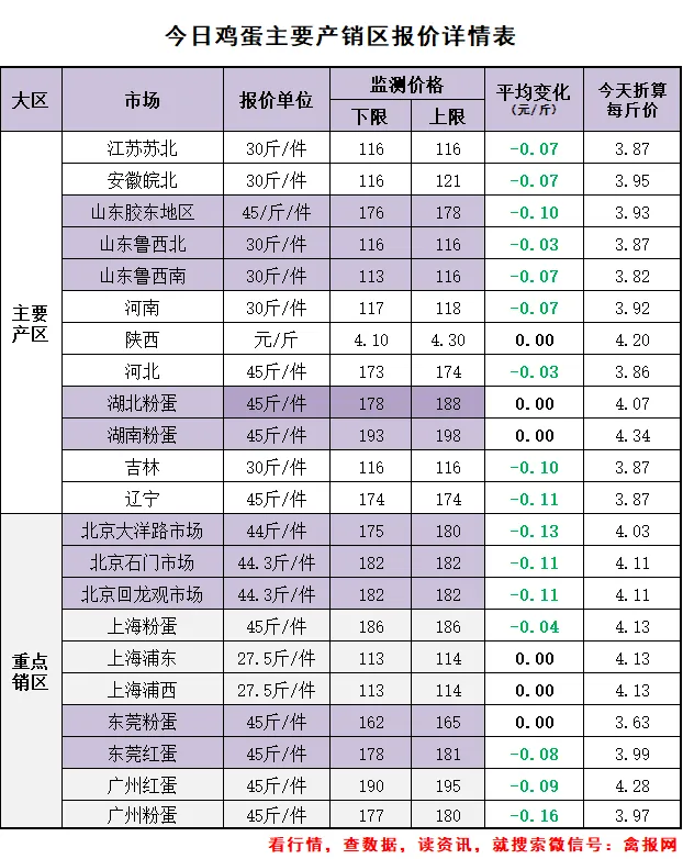 其中:主要产区综合均价3.94元/斤,较前一日下跌了0.06元/斤;主要销区综合均价4.05元/斤,较前一日报价下跌了0.07元/斤。
