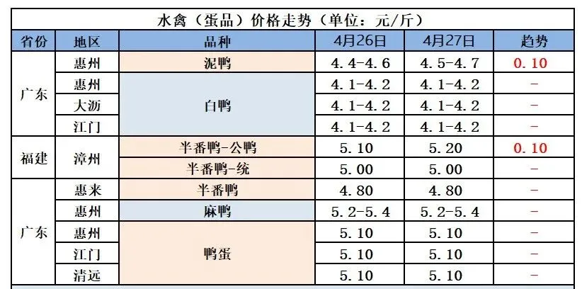 4月27日南方桂柳广东区域毛鸭报价(元/斤) |