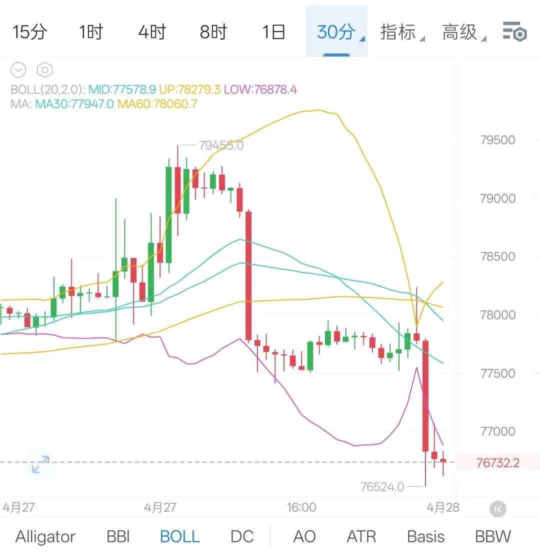 而从当前的磐面结构来看,日线级别在前高区域连续受阻,上方抛压明显增强,当前K线形态已经开始由强转弱,短期存在继续向下修正的需求;四小时级别来看,行情在完成高位区间运行后向下跌破整理平台,结构发生改变,均线系统开始拐头向下,反弹过程中高点逐步降低,说明上方承压持续存在,是当前判断方向的核心周期;一小时级别则表现为反弹力度有限、下行节奏清晰,行情运行重心持续下移。关键位置方面,大饼上方压制重点关注77500—78000区间,其次是78500一带,下方支撑看75000附近;以太上方压制在2320区域,下方支撑关注2250一线。综合来看,各周期尚未出现有效止跌结构,当前走势仍然由空头主导,后续操作思路继续以做空为主。