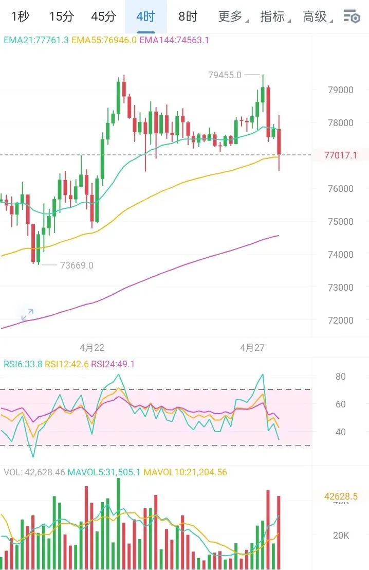 技术形态上,78300一线形成新的短期顶部,价格快速跌破77500及77000两道支撑,四小时级别连续收出实体阴线,均线系统开始拐头向下形成压制,MACD快线下穿零轴,动能柱由正转负并逐步放量,显示空头动能正在主导市场节奏。