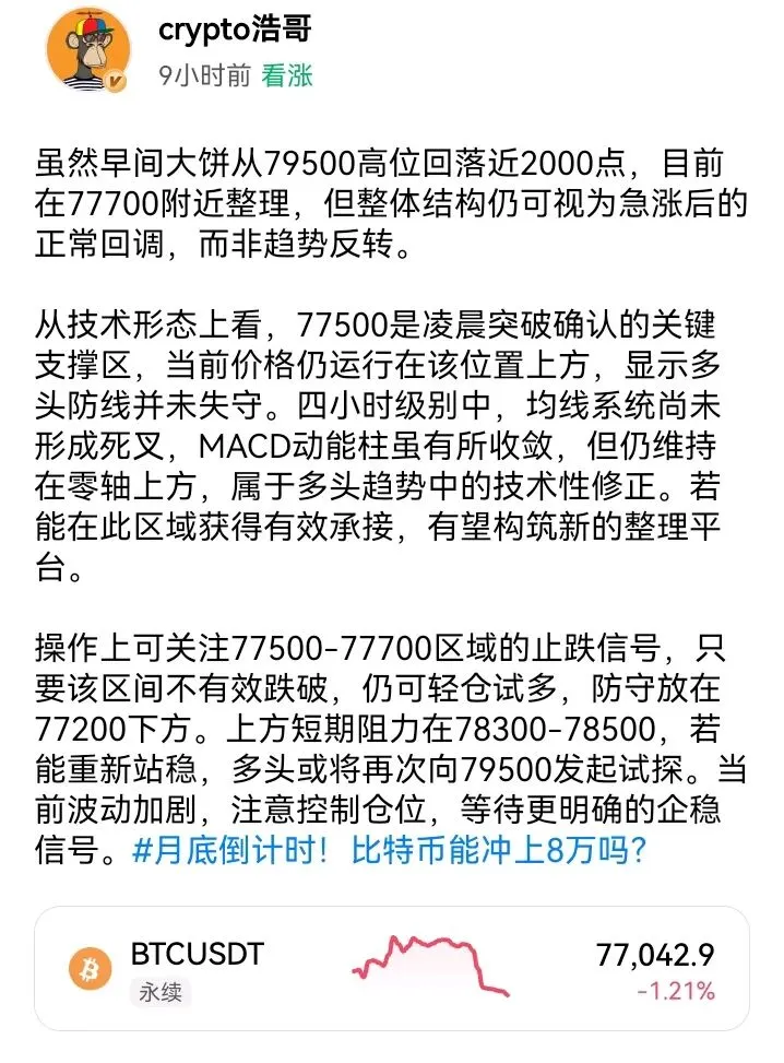 下方关注76500附近的低点支撑,若该位置被再度触及或实体跌破,将进一步确认调整空间打开,后续或向下测试76000及75500区域。操作上以反弹高空为主,可关注77000-77300区间的压制力度,防守放在77800上方即可。当前市场情绪偏弱,反弹力度可能有限,需注意若价格快速收回77500上方,则空头结构可能暂时失效,应灵活应对。