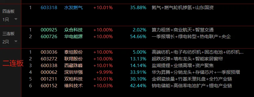 - 水发燃气(603318):4 连板,燃气 + 储能,低位低估值,资金避险抱团,为当前市场高度标杆。