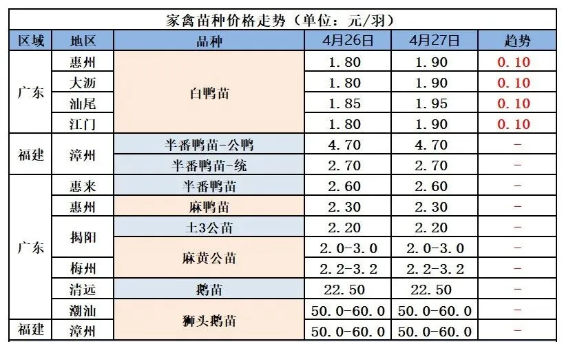 微评:鸭苗报价上涨。(注:南方只报当天价格)大厂控量保价,排苗计划偏紧,窄幅波动为主。根据产品、养殖成本及鸭苗现状分析,预计近期鸭苗价格呈震荡微调趋势。种蛋报价稳定。温馨提示:该价格为主流厂家报价,实际销售价格以成交价格为准,价格仅供参考。