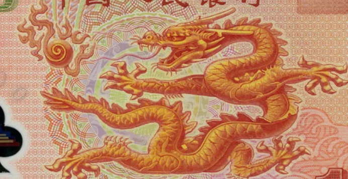 图中这条张牙舞爪的红金色大龙,正是2000版龙年纪念钞最扎眼的地方,票面正中央——一条威风满满的升龙,从云海里腾空而出,龙头冲着一团火球,眼神直勾勾,好像下一瞬就要抢下那团火,整张票色调喜庆,金红交错,新人第一眼看还以为是哪家婚礼专用喜钞。摸上去跟普通钞票不一样,塑料材质,比普通纸币滑溜,还透点光,防水耐磨,真不稀罕。