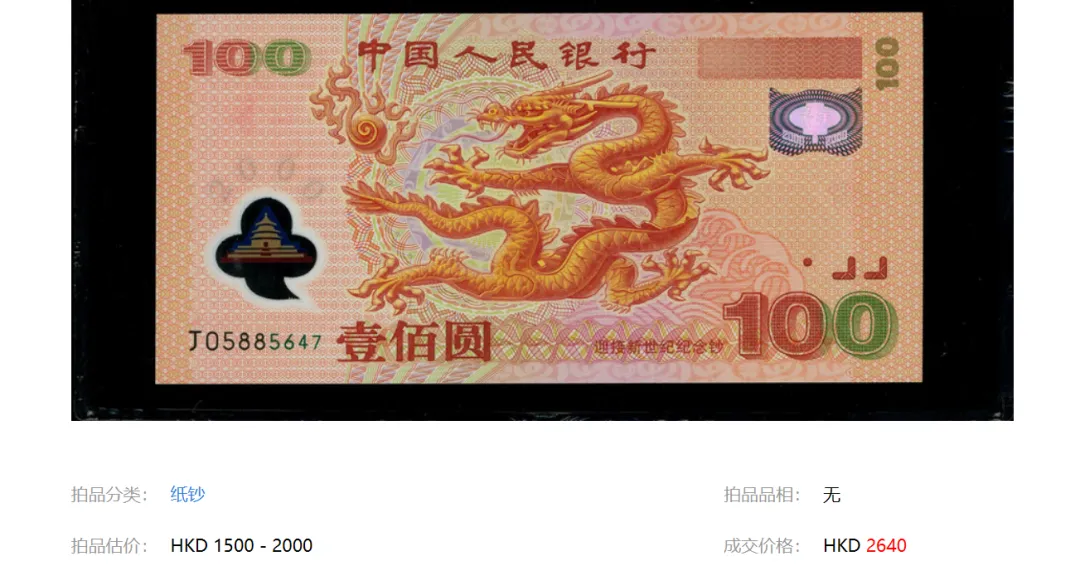 前两年看到香港有场拍卖,就是一张品相相当漂亮的龙钞,评级66EPQ,成交价2640港币,折成人民币也得两千多,和当初百元面值比,翻了不止二十多倍。我妈当时看到新闻还问,真有人出这价买一张票吗?我说这就是收藏讲究,评级高的、号码正的,差价能差出一台洗衣机。