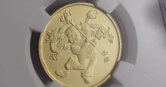 这面就有意思了,图中小孩穿得喜气洋洋,手一扬正舞着龙头,龙身盘得有点意思,鳞片一片片光滑细腻,龙角朝天分出几叉,舞龙的小孩脚下带劲,一手提道具一手露笑,爷爷在旁边看着直乐,一边说“小时候正月十五,村口舞龙队都抢着拿这龙头,边上敲锣打鼓,队伍一圈圈转”,那时候龙年纪念币出来,邻居都问家里谁能抢着买一枚,抢不到只能干瞪眼。