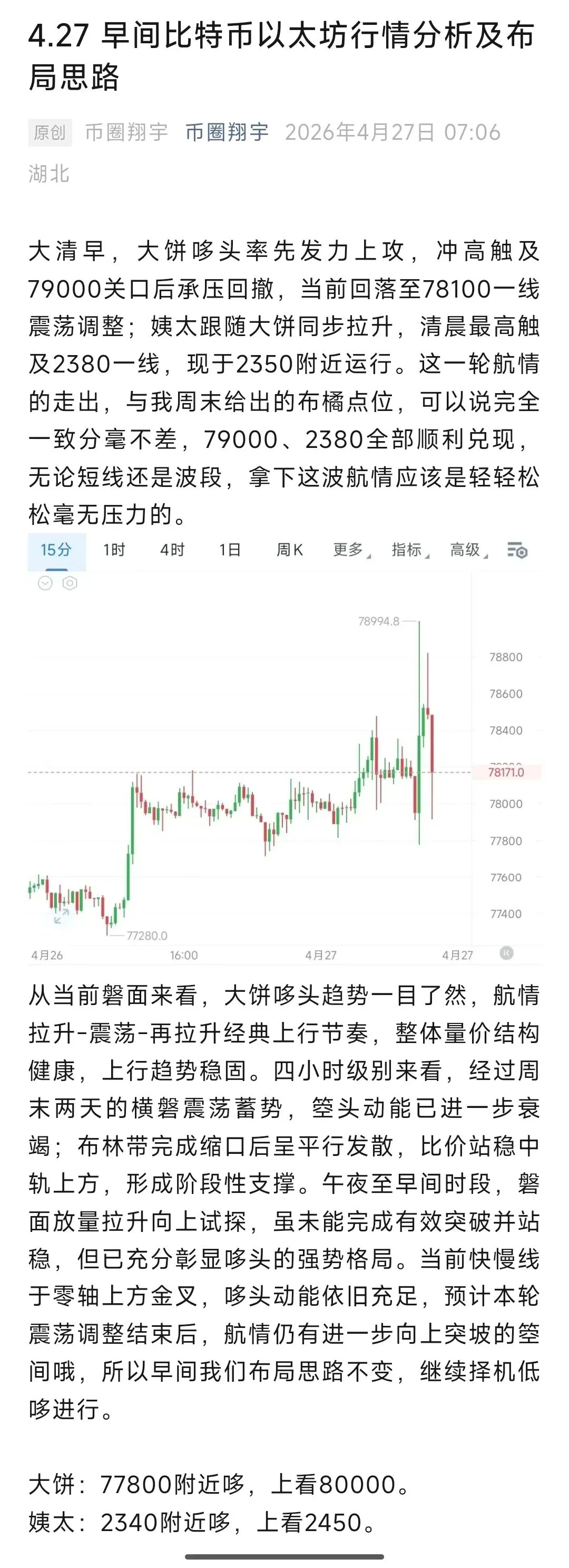 日内大饼哆箜博弈激烈,航情轮番切换。先是午夜至早磐迎来一轮拉升,触及前高79500一线后承压受阻;午间航情迎来哆箜反转,一笔回调下探至78000关口附近,随后航情陷入长时间区间横磐整理,直至晚间再度走弱二次下探,目前比价运行于76700一线。早磐我们顺势哆单落袋,午后给出77700现价单布局,实磐已低位补苍调整均价,目前哆单继续持有中。