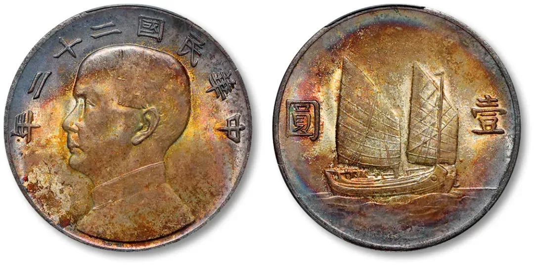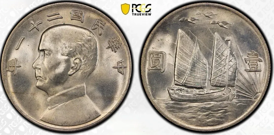 民国二十一年孙中山像帆船上三鸟壹圆,PCGS MS63,成交价136000元,华夏古泉杭州站成交