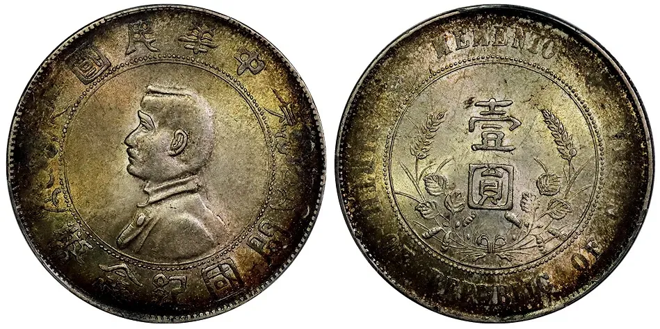 孙中山像开国纪念壹圆 下五星,PCGS AU58,成交价61000元,华夏古泉雄安站成交