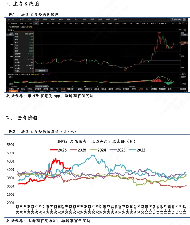 【1】期货盘面:4月27日国内白天收盘,BU2606主力合约大幅高开后震荡上行。收盘价4283元/吨,较上一交易日(4月24日)结算价4193元/吨,环比上涨90元,涨幅+2.15%。盘中最高触及4289元/吨,最低4157元/吨,开盘4175元/吨,日内振幅132元。持仓量230,610手,成交量484,736手,成交活跃,多空资金均明显进场。
