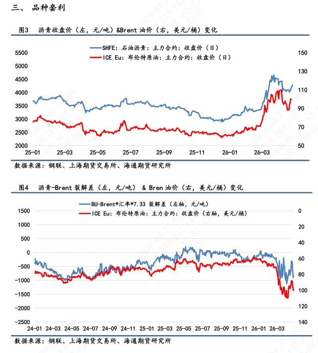 【4】地缘成本因素:近期BU2606主力合约整体价格重心持续上移,驱动力主要来自原油端,美伊谈判进展成为核心变量。美伊和平谈判正式宣告陷入僵局,特朗普临时取消赴巴基斯坦谈判行程,伊朗同期提出分三阶段谈判方案但美方拒绝当面接触,霍尔木兹海峡过去24小时艘船只通过寥寥无几。当天Brent油价维持100美元/桶上方,环比上涨2%。