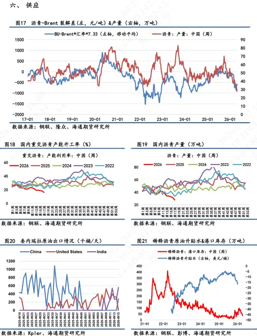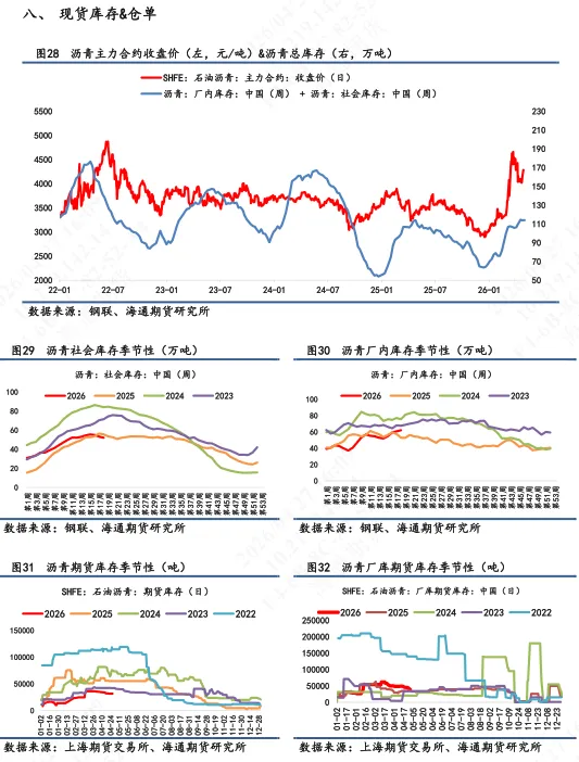 ③库存端,厂内+社会库存累计114万吨,环比基本持平。其中厂库录得62万吨,环比上涨2%;社会库存录得52万吨,环比下跌2%。社库回落突破2025年同期水平,也即验证前期所说沥青基本面被迫收紧。