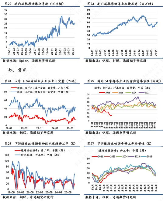 ①截止4月24日当周,供应端,国内炼厂产量为27.7万吨,环比下跌12%,沥青装置开工负荷率继续低位运行(4月中上旬全国平均22.68%,环比仍呈下降趋势),岚桥石化、辽河石化降负,西北和华南个别主营炼厂停产,供应端收紧预期持续存在。