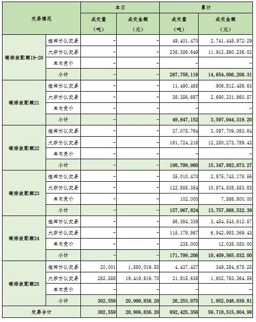 今日全国碳排放权交易市场成交总量302,559吨,成交总额20,999,836.2元,成交均价69.41元/吨。截至今日,全国碳排放权交易市场累计成交总量892,425,356吨,累计成交总额59,718,515,004.98元。