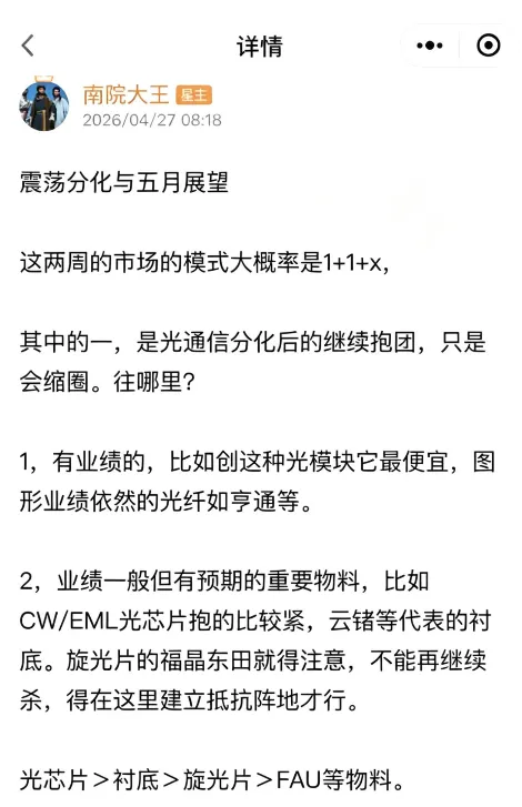 - 操作建议:轻指数、重结构,控制仓位 5–6 成;聚焦一季报超预期的半导体设备、算力硬件,规避高位题材与业绩雷区。