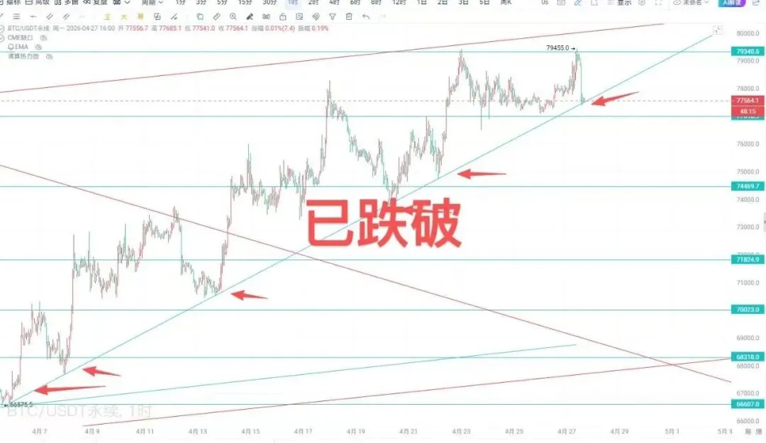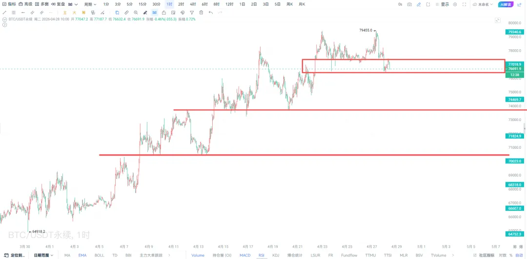 现在是2026.04.28日上午的10:48分,目前长线空单继续持有,昨日下午77650附近市价短线多单在开单后一小时赔了手续费跑路,差点被狗庄骗炮。
