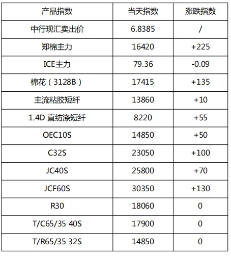受郑棉持续上涨影响,今日部分大型纯棉纱纺企报价继续上调 100-300 元/吨,其中 40S 系列因走货持续较好,报价上涨较高。受报价持续上涨影响,近期纺企整体新增订单趋缓,精梳高支纱成交稍有走淡,当前纺企整体库存水平持续维持低位,后续持续关注郑棉走势和下游开机。