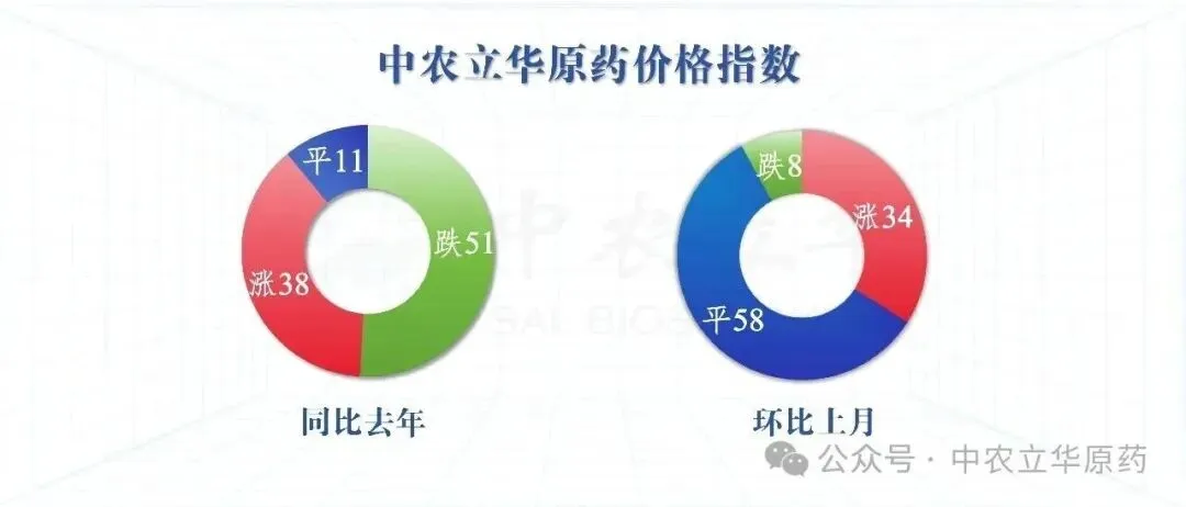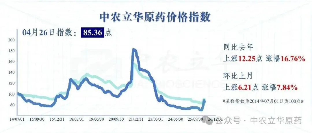 2026年4月26日,中农立华原药价格指数报85.36点,同比去年上涨16.76%,环比上月上涨7.84%。跟踪的上百个产品中,同比去年51%产品下跌,11%产品持平,38%产品上涨;环比上月8%产品下跌,58%产品持平,34%产品上涨。