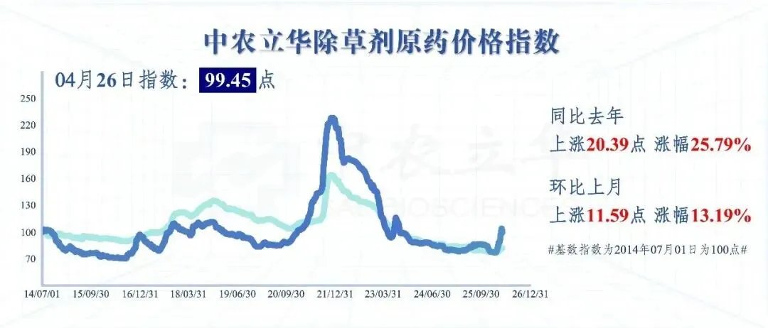 2026年4月26日,中农立华除草剂原药价格指数报99.45点,同比去年上涨25.79%,环比上月上涨13.19%。