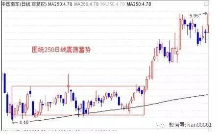 上图是601766中国南车(601766)的日K线图,股价于09年8月中旬至11月中旬,在250日线附近蓄势震荡调整近3个月,之后在量能的推动下,展开了一波近30%的涨幅!